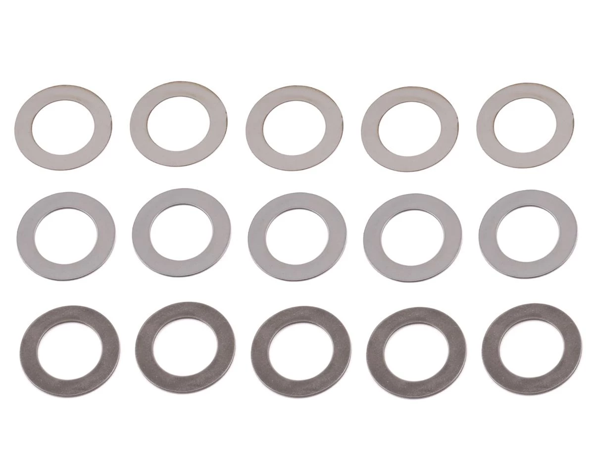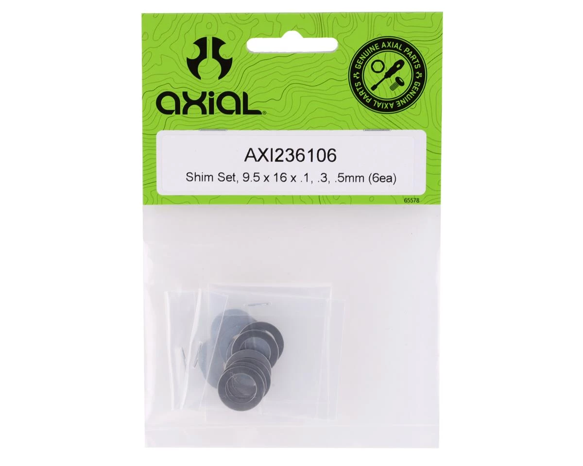 Axial 9.5x16x.1/.3/.5mm Shim Set. This replacement shim set features three different sizes of 9.5×16 shims and is intended for the Axial RBX10 Ryft.