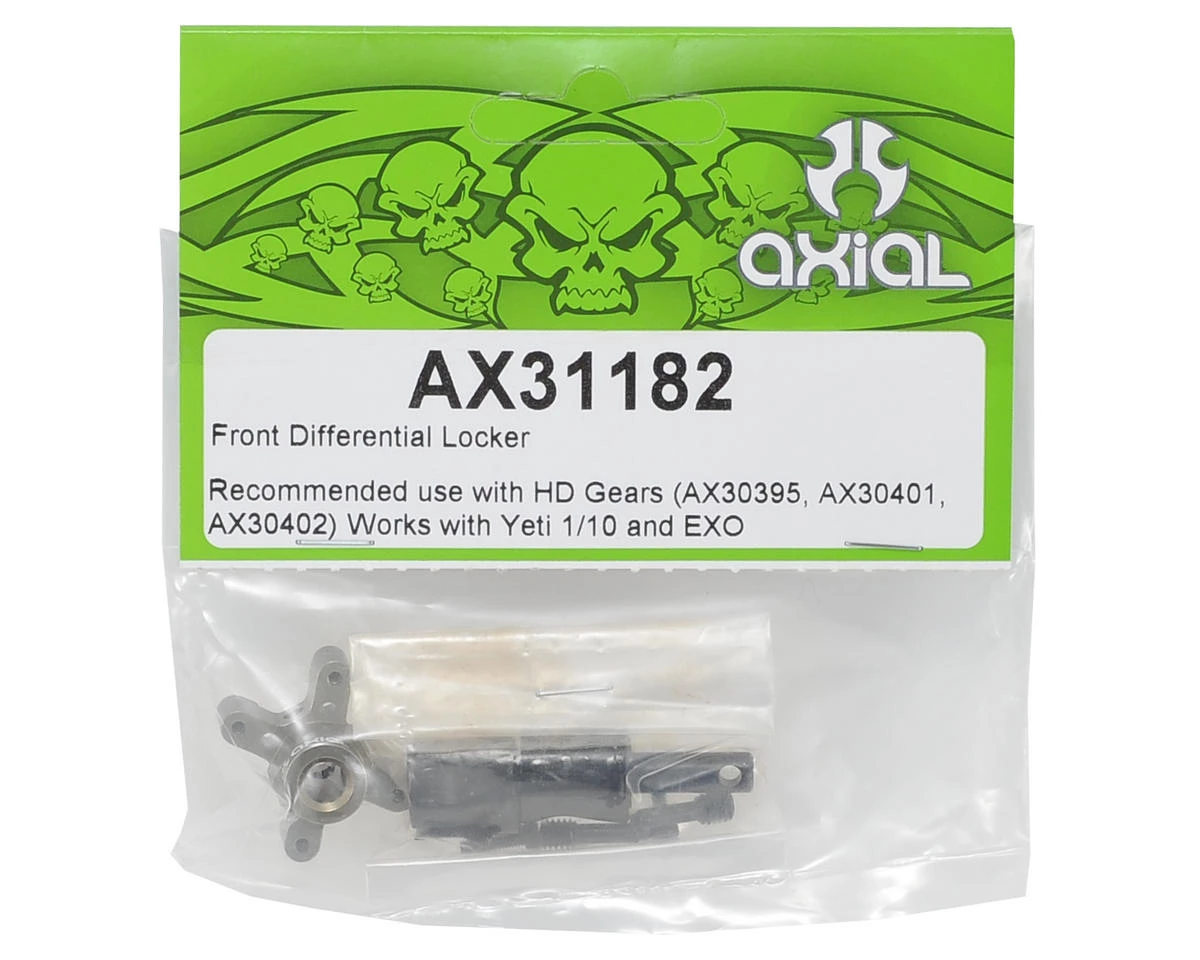 This is an optional Axial Front Differential Locker.Β This locker replaces the differential gears in the front differential to provide a locked-out, solid axle.