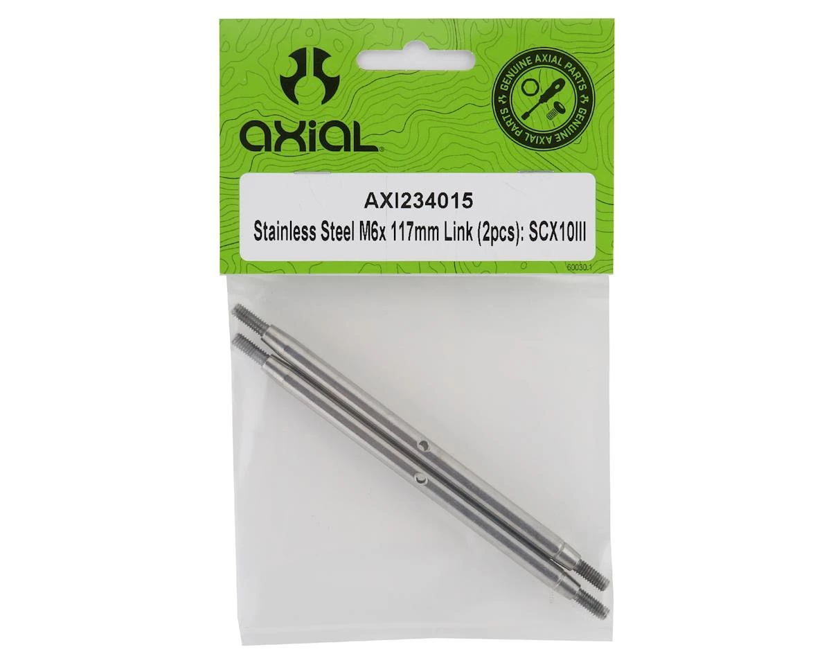 Axial SCX10 III 6x117mm Stainless Steel Link. Package includes two replacement links for the Axial SCX10 III. In the stock configuration, these links are used in the rear lower link position.