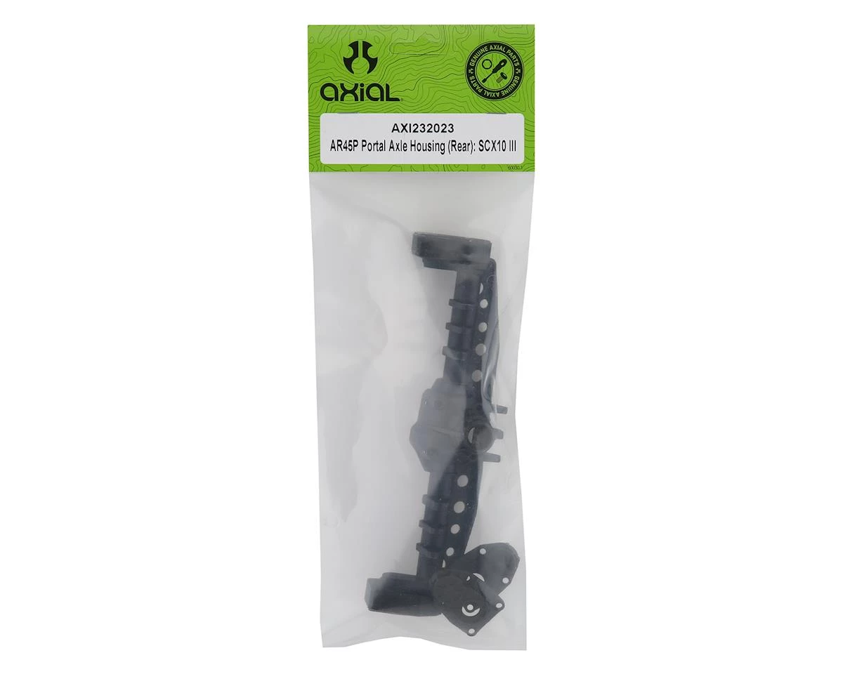Axial SCX10 III AR45P Rear Portal Axle Housing. This is the replacement rear axle housing for the Axial SCX10 III. Package includes one rear axle housing and two portal box covers.