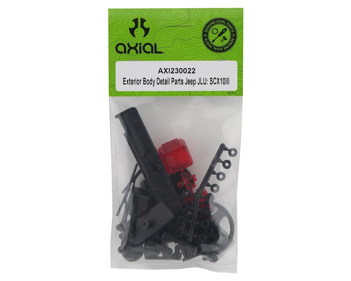 Axial SCX10 III Jeep JLU Exterior Body Detail Parts. This is the replacement exterior body detail set for the Axial SCX10 III Jeep JL.